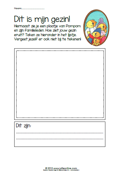 Op dit werkblad kunnen de kinderen hun gezin tekenen. Wie horen daar allemaal bij? Dat is per kind natuurlijk verschillend. Als het klaar is zet je er daarom zelf nog even onder wie ze allemaal hebben getekend.